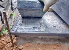 Привозим заранее изготовленное гранитное ограждение, согласованное с клиентом. На этапе монтажа цоколя зачищаем от полировки все соприкасающиеся поверхности и делаем на них засечки: это поможет клею лучше схватиться, тем самым продлевая срок службы ограждения. Балки мы приподнимаем за счёт специальных проставок. Такое решение очень удобно: в пятисантиметровые щели будет уходить скапливающийся на могиле мелкий мусор, во время дождя туда будет стекать вся влага, а при выполнении влажной уборки достаточно будет просто пролить территорию места захоронения необходимым количеством воды.